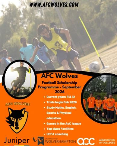 The AFC Wolves Football Scholarship Programme is a full-time education and football pathway for young people aged 16–18, designed to support progression both on and off the pitch.